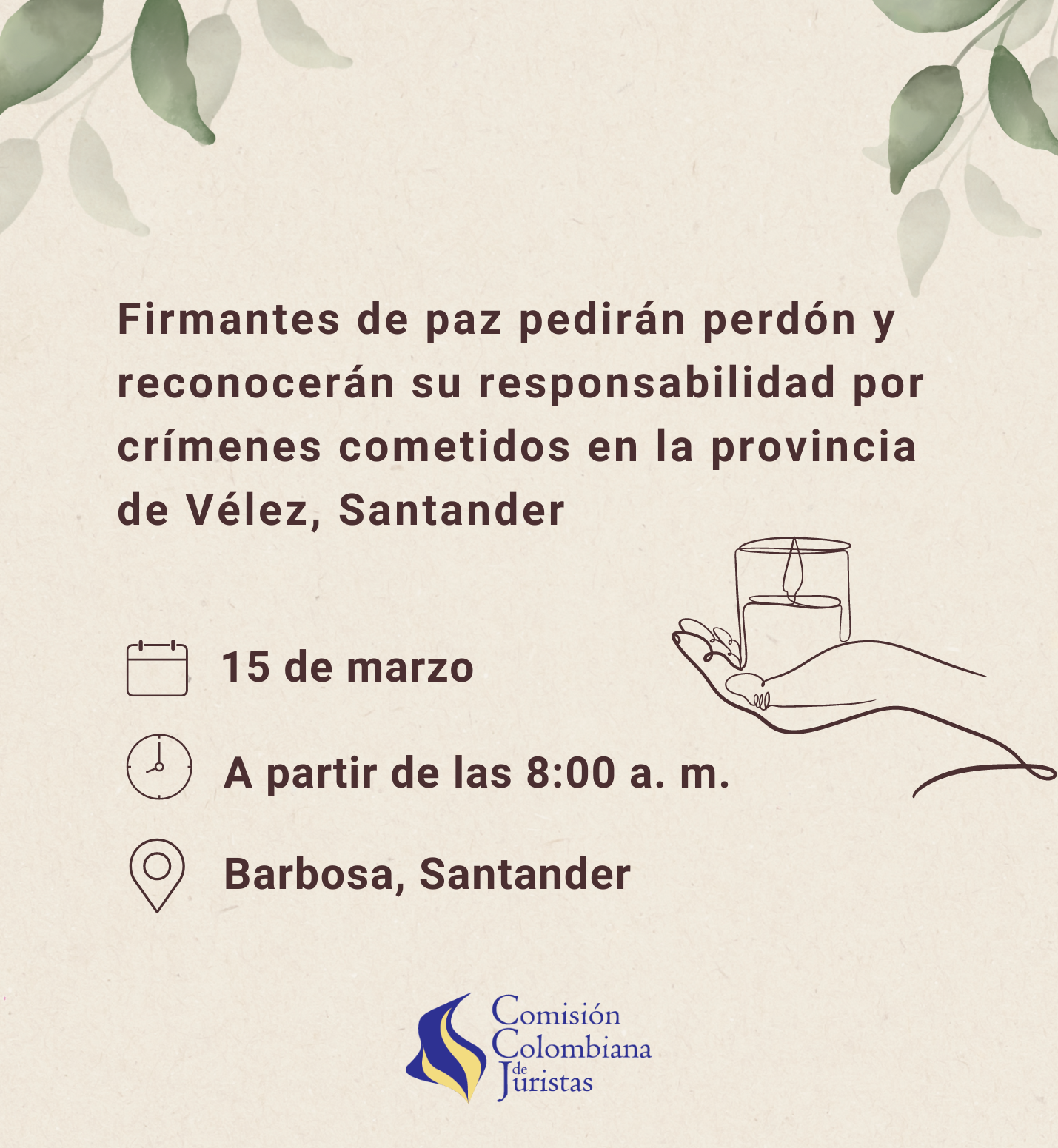 Fue justamente en el espacio de una de estas audiencias que Yeferson Mario Suárez, víctima que apodera y acompaña la Comisión Colombiana de Juristas (CCJ) e hijo de Mario Suárez, secuestrado por el Frente 23 mientras era candidato a la alcaldía de Landázuri, Santander, expuso la necesidad de que los firmantes de paz ofrecieran disculpas públicas a la comunidad de Vélez.