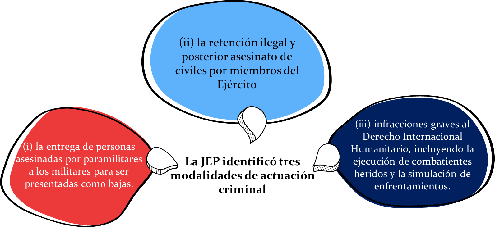La sentencia subraya que estos crímenes están tipificados en el Código Penal colombiano y constituyen también crímenes de guerra y crímenes de lesa humanidad, conforme al Estatuto de Roma. De manera relevante, la JEP afirmó que la responsabilidad del condenado no dependía de su presencia directa ni de la emisión de órdenes explícitas, sino del control ejercido sobre el aparato organizado de poder y del funcionamiento sistemático del patrón criminal.